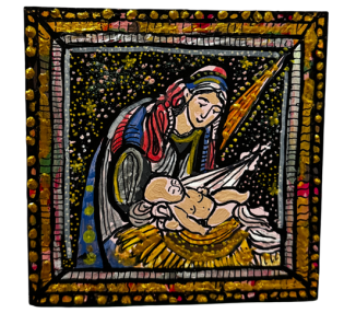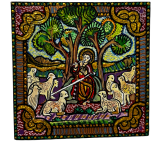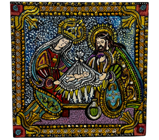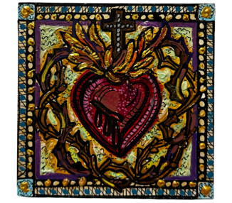 PINTURA ACRÍLICA + TINTA DE COLORES SOBRE TABLA CUADRADA DE 17 X 18 CMS.